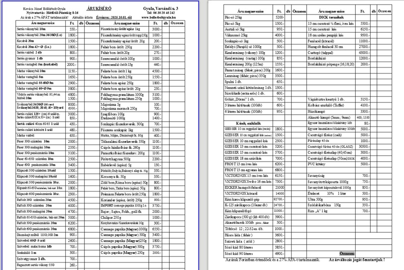 Az árak tájékoztató jellegűek. Az aktuális árakról kérem a megadott telefonszámokon érdeklődjenek mert előfordulhat, hogy egy-egy termék ára változik.